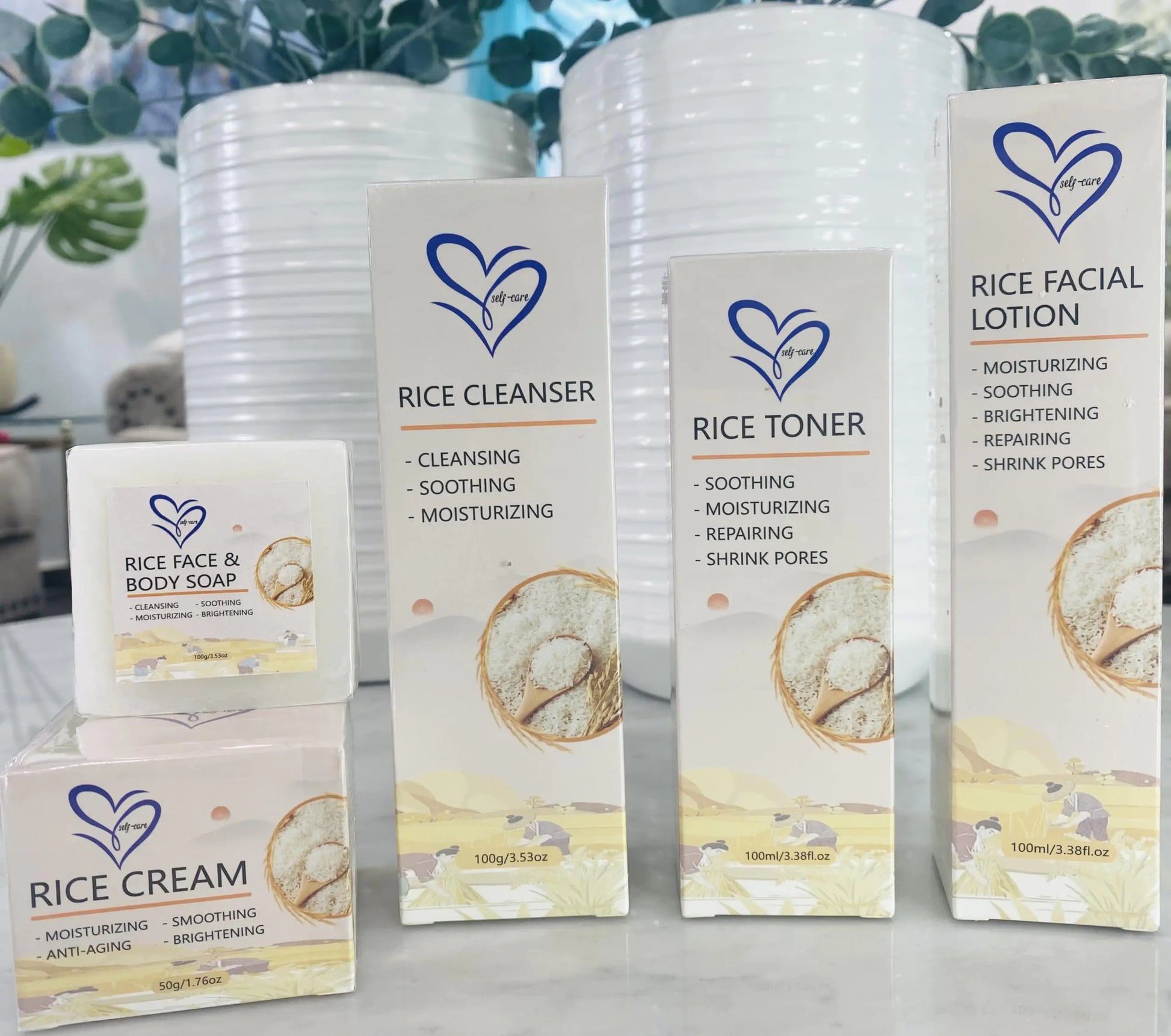 Descripción Set de cuidado de la piel antienvejecimiento de arroz Nuestro kit antienvejecimiento para el cuidado de la piel es rico en suero de arroz que puede suavizar las arrugas mejorar la condición de la piel reducir la opacidad de la piel la sequedad y restaurar la elasticidad de la piel. Kit de cuidado facial hidratante El kit de rutina para el cuidado de la piel para mujeres que contiene extracto de arroz puede penetrar profundamente en la capa inferior de la piel. Reponer y reparar el agua perdida mejorar el problema de poros dilatados o obstruidos piel excesiva de sebo y piel áspera. Absorbido rápidamente por la piel El juego de productos para el cuidado de la piel tiene una textura ligera sin sensación pegajosa gruesa no obstruye los poros penetra rápidamente en la piel y se absorbe rápidamente. Adecuado para todo tipo de piel. El kit de rutina para el cuidado de la piel es adecuado para todo tipo de piel como piel seca piel grasa piel sensible y aquellos que se quedan despiertos hasta tarde Regalo perfecto para mujeres de todas las edades Gran kit de cuidado de la piel facial para mujeres niñas adolescentes. El paquete incluye: 1* lotion de arroz 1* tóner de arroz 1* limpiador de arroz 1* crema facial de arroz